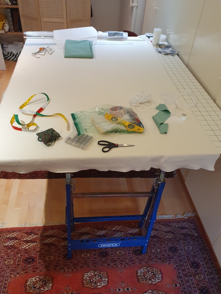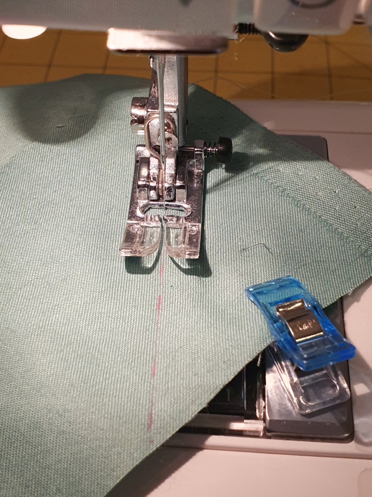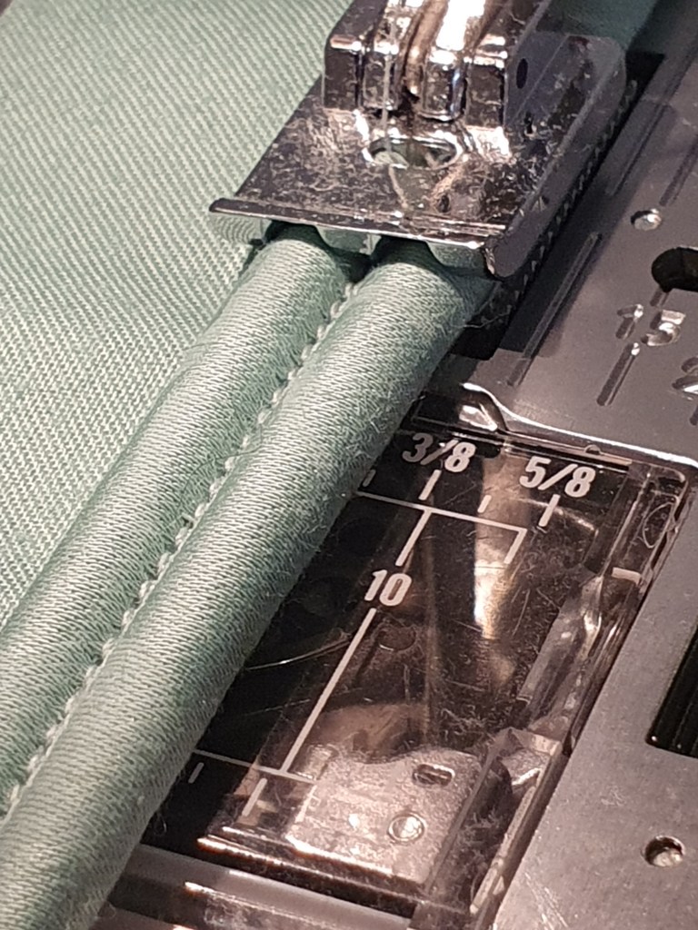 This is used around upholstered surfaces to hide tacks and staples. The alternative is to use a braid, but there’s usually a strip of fabric or two left that can make piping. If neccessary, fabric strips are joined at 90 degrees. That avoids unneccessary bulk in the join. Then a special foot is used, visible in the lower image, to stitch the piping cords into the casing.